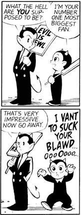 - Seymour in Sinfest, -- an ultra-religious character who goes around chiding people for not being pious enough. God refers to him as his "loony fanboy." The devil thinks God needs a better representation and likes to make fun of him. He has his own lame-ass fanboy as well. Who writes "Devil Fanfics". These two tend to be funnier together. Monique tried to play a crazy fangirl, but wasn't ready to go far enough to be believable, so she... outsourced this.