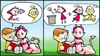 - Of all comics, Sinfest looks to be going this route with Fuschia, one of the Devil's "Booth Babes", as falling for Criminy has made being evil considerably less fun for her. She asks him to re-read a story that's been altered to feature her redemption.