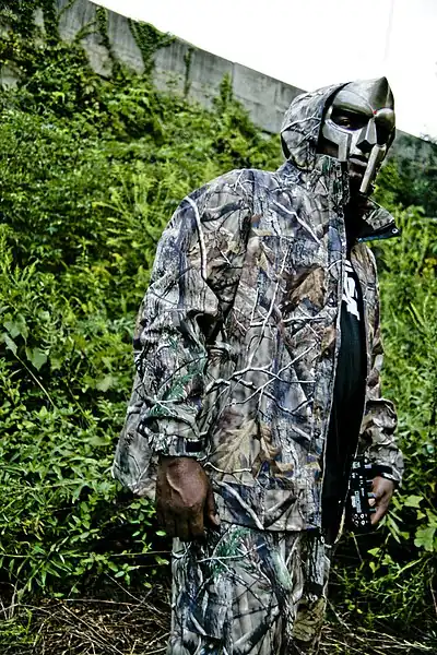 DOOM, born Daniel Dumile, had some success as a rapper in the early '90s under the name Zev Love X. However, the tragic loss of his brother in a car accident in 1994 caused him to retreat from the hip-hop world and sink into a deep depression. He eventually became homeless on the streets of New York; in interviews, he describes himself in this period as "recovering from his wounds" and swearing revenge "against the industry that so badly deformed him." If this sounds like a Super Villain origin story, well, the similarity didn't escape him either. When he recovered and returned to the world of hip-hop he adopted the identity of MF DOOM, an Expy of the Fantastic Four villain Doctor Doom. DOOM has consistently worn a Cool Mask since he returned to performing; it is nearly impossible to find pictures of him from after 1998 or so in which he shows his face.