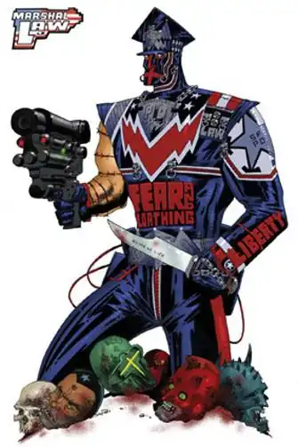 Marshal Law - formerly Joe Gilmore and a member of the Super Human squad the Screaming Eagles - is having none of it, however. Having seen the war crimes committed by the so-called-Super Heroes, he became a cop to combat the gangs of Surps (Surplus Superheroes) in the San Futuro area. Not only does he fight the nearby gangs like Gangreen from his secret police headquarters, but he also fights Super Heroes like Public Spirit and Private Eye. (Superheroes in Marshall Law's world fall into two categories: dangerous, or pathetic and delusional. The categories frequently overlap.)