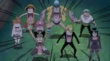 - A Running Gag in One Piece is the normal folks' responses to the Straw Hats' overpowered antics.