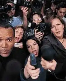From Rugby, a Media Scrum is a knot of reporters and camera men gathered around someone, usually a politician, each trying to shove forward to ask their questions and catch the answers to the others' questions. Also known as a "gangbang."