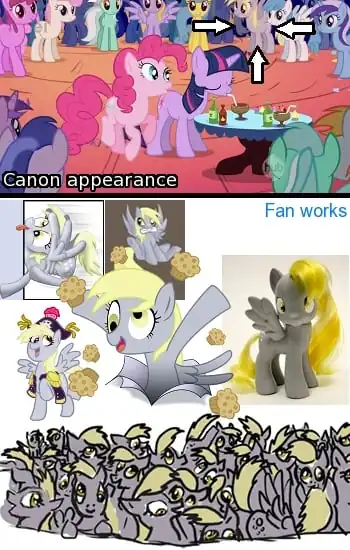 - Derpy Hooves, a grey, cock-eyed pony spotted in episode one, is almost as popular as the mane cast, and the one with the most solidified fan-made traits (No Sense of Direction, a master of Achievements in Ignorance, loves her daughter, et cetera), to the point where Lauren Faust herself said "She can be Derpy if everyone likes." One of her fanon traits (works as a deliverypony) was canonized in the episode "Feeling Pinkie Keen", which also showed she's not that good at it. Fanon has also given her a unicorn daughter named Dinky (as well as a speech impediment known as logorrhea, though this was quickly dropped after her first speaking role).