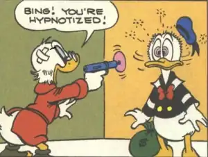 - Actually kind of subverted in the Donald Duck comic The Hypno Gun by Carl Barks, from which the page picture is taken. The titular hypno gun is in fact just a harmless toy gun that Huey, Dewey and Louie pretend to hypnotize one another with... however, Donald, overhearing them, thinks that it's a real hypno gun. Donald is, in fact so convinced that the hypno gun works that it actually does work on him, even if it doesn't work on anyone else.