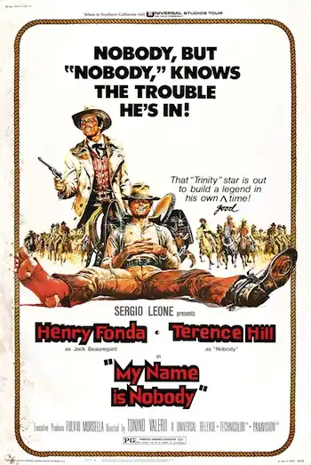 My Name Is Nobody (1973) is an Affectionate Parody of the Spaghetti Western, originally released in Italy as Il mio nome รจ Nessuno and starring Henry Fonda as an aging, legendary gunslinger named Jack Beauregard who wants nothing more than to retire in peace, and Terence Hill as "Nobody", a man who idolized Beauregard and wants to see him die in a blaze of glory fighting singlehanded against the infamous Wild Bunch.