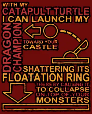 - One example in Yu-Gi-Oh (the former Trope Namer in fact) comes from an early episode (which can be seen in episode 10 of the "Abridged Series"), where Yugi uses a monster called Catapult Turtle to launch a fusion monster, Gaia the Dragon Champion, at another monster, Panik's Castle of Dark Illusions. This destroys the Dragon Champion on impact, causing Yugi to lose most of his Life Points and the castle's flotation-ring to fall off, but seemingly doesn't destroy the castle... until Yugi mentions that the Castle is now being held up by Yugi's Swords of Revealing Light. Yugi ends his turn, ending the effect of SoRL, thus causing the destruction of the Castle... and all of Panik's monsters, which were underneath and, due to Panik's Chaos Shield, couldn't get out of the way in time. If these things had been real, physical creatures engaged in a battle, this would be reasonably creative and entirely valid. But they're just tokens in a card game, subject to the rules thereof, and Yugi's trick has absolutely no basis in the rules (but it looked cool). The real card game hadn't yet been made when this episode was written, but unless the writers thought the real card game would somehow simulate Newtonian physics, it still doesn't make much sense.