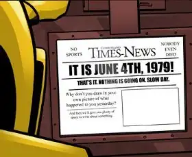 - Parodied in The Adventures of Dr. McNinja. The time traveler in question looks at a newspaper to see what year it is, and, well... see for yourself.