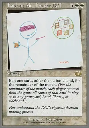 - Lampshaded in the series' own Unglued and Unhinged expansions, with cards like Look At Me, I'm The DCI!, which featured current Head Designer Mark Rosewater's stick-figure drawing of a blindfolded figure picking what to ban by throwing darts at cards pinned to a dartboard. Other Unglued cards have 'errata' printed on the card.