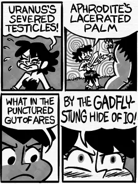 - Gastrophobia being set in Ancient Greece (well, The Theme Park Version), this is naturally used. Like other webcomics example, Phobia often swears by the anatomy of said gods, with several examples on this very same strip.