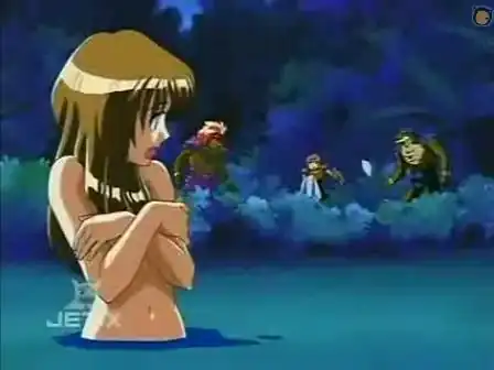 - Pictured above: In the 7th episode of Shinzo, Yakumo is looked at while bathing in a lake by monster warriors who try to attack her. But Mushra shows up and fights them -- and gives Yakumo a towel.