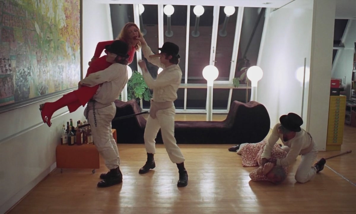 - A Clockwork Orange: Mrs. Alexander is slung over Dim's shoulder while Alex gags her and sings "Singin' in the Rain"