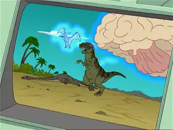 - Fry finds out what really killed the dinosaurs in one episode of Futurama, when he encounters a giant brain that knows everything.
