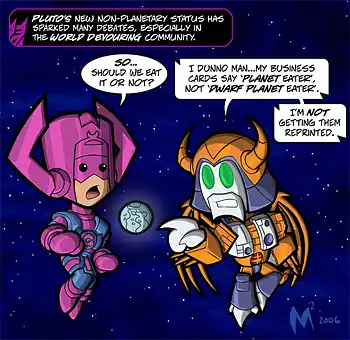 - In the 2008 Virgin Comics revival of the classic 1950's British space hero Dan Dare, written by Garth Ennis, Pluto is destroyed by a "tamed" black hole controlled by Dare's nemesis, the Mekon. Since the series takes place in the "present" of Dan Dare's retroactive alternate history timeline, the destruction may have been a tongue-in-cheek spoof of Pluto's demotion to dwarf planet status in 2006.
