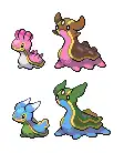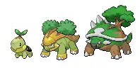 A small, green turtle with a sprout on its head, its evolution gains shrubbery on its (much bigger) shell, while its final evolution gains a Ground-type, as well as becoming a massive turtle with what could be described as a small forest on its shell. While this starter evolution line manages to have both a strong Defense (stats-wise anyways, Grass comes with a large number of weaknesses, and its Special Defense is a bit faulty) and offense, it is the slowest fully evolved starter at 56 base Speed. It gets Rock Polish, which helps it overcome the poor Speed...if it can live long enough with its poor defensive type and not that great defenses.