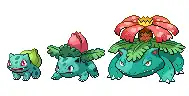 Bulbasaur is a quadrupedal toad-like creature with green-blue skin and a green plant bulb on its back; it can stand on its back legs occasionally. The bulb grows from a strange seed planted at birth and conceals two slender tentacle-like vines - it provides Bulbasaur with energy through photosynthesis and stored nutrients. Bulbasaur's first evolution Ivysaur (obtainable starting at level 16) is larger and more blue in color, and its bulb has bloomed into a pink, leaf bud: Both Ivysaur and its plant are strengthened by sunlight, and the weight of the plant eventually prevents Ivysaur standing on its hind legs, causing it to become more sturdy as a result. When its flower is ready to bloom, it gives off a distinct, sweet-smelling aroma and starts swelling, and Ivysaur will start spending more time in sunlight to prepare for evolution.