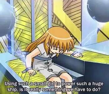 - Magical Girl Lyrical Nanoha StrikerS has the Saint's Cradle, a massively overpowered Cool Starship that can only power-up when commanded by a direct descendant of the Saint Kings of Ancient Belka. The problem? The last Saint King died over a hundred years ago without any heirs, so their bloodline is effectively extinct. So what is a Mad Scientist to do? Why, clone the last Kaiser, infuse said clone (despite her being a six year old little girl, the one pictured above) with a Lost Logia, torture her until she is under his complete control, then make her activate the Cradle, despite how utterly painful the process is for her. The problem with that? Little Vivio just had to go and get herself adopted by not one, but two Action Moms. Each of whom is a Magical Girl Warrior Person of Mass Destruction. And they are not happy about their adoptive daughter's treatment. And just to add to the fun, their good friend is another magical Person of Mass Destruction and is in command of a military unit, and other friends of them are also very powerful Action Girls and Magical Girl Warriors..
