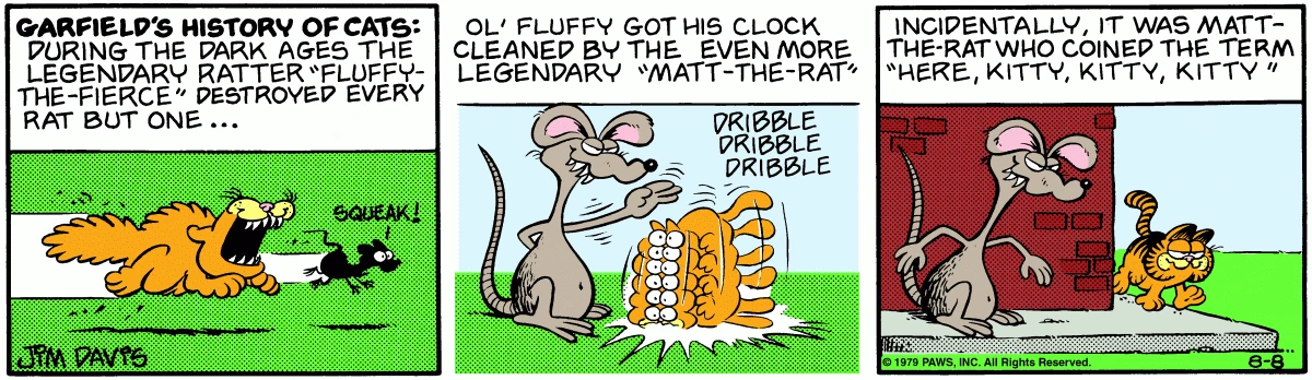 - In an old series of Garfield strips, Garfield relates how, during the Dark Ages, the legendary rat catcher Fluffy the Fierce killed every rat but one, before being defeated by Matt the Rat. Who not coincidentally, coined the phrase, "Here, kitty, kitty, kitty!"