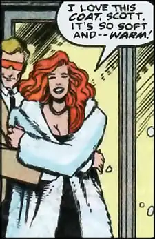 - X-Men: Jean Grey wears a white fur coat (see the picture above) in one issue of the first series of X-Factor, since her Little Black Dress isn't keeping her warm outside in the winter. It's also never seen after that. This could be because of all the times the superheroes' headquarters are destroyed, or because she got smart and put it in a safe place to wear "off panel" (like when the heads at Marvel allow her to come back).
