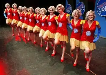 Traditionally, the Kickline is made up of 8 to 12 of Triangle's burliest male members, done up in Incredibly Conspicuous Drag. The choreography is almost always implemented as a classic Busby Berkeley Number, and while the dance will vary widely from year to year, it always ends with the performers in a line doing high kicks to the blaring accompaniment of the orchestra.