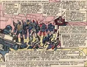 - The trope picture is from issue #1 of the original Transformers limited series. After the Autobots and Decepticons have been reactivated on present-day Earth, each faction gets an oversized Wall of Text panel so everyone can introduce himself and his powers. Note that this was occurring while the Decepticons were in the Autobots' base, and both factions had just reawakened and everyone was very vulnerable.