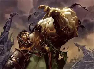 - Fungus brew in Warhammer Fantasy gives the goblin chugging it superhuman (OK, supergoblin) strength. It also turns them into a gibbering lunatic who has to be subdued by the rest of his unit sitting on him until the enemy get close enough, at which point said goblin is hurled at the enemy and left to rotate around the field for the rest of the battle, pulverising everything he crashes into with an Epic Flail... until the brew wears off (causing a brief demonstration of a spiral in action), or the goblin crashes into a tree, is pulled down by sheer weight of numbers, or gets shot by the enemy/his own side (depending upon tactical needs). A hero with the Madcap Mushrooms can make this even worse for whoever gets hit.