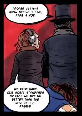A sub-trope of Even Evil Has Standards when rape disgusts a villain, and the opposite of Rape Is Love. Compare Wouldn't Hit a Girl, Wouldn't Hurt a Child. Contrast Black Comedy Rape. Related to the idea of rape as a Fate Worse Than Death. When refusal to engage in this is a sign of the good guys superiority it is The Women Are Safe with Us.
