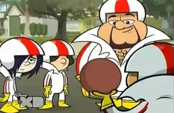 - Kick Buttowski: Kick enlists the entire neighborhood to dress up and behave like Kick to confound the neighborhood tattletale. They're all onscreen at the same time doing Kick-related mayhem and Ms. Chickorelli's logic fails when the real Kick emerges from his home, having been cleaning his room the whole time. Cue the unmasking sequence with the neighborhood kids (and some of the adults) taking off Kick helmets.