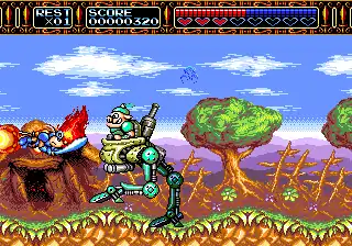 Rocket Knight Adventures is a side-scrolling action platform game series by Konami with diverse and distinctive gameplay mechanics such as short-range jetting in eight directions (including ricocheting off walls and around corners), charged attacks, swordplay, the occasional bit of shmup-style sustained flight, and much much more. The original game, on the Sega Mega Drive/Genesis, spawned two more games: Sparkster: 2, a sequel also on the Mega Drive, and Sparkster, a game on the SNES which takes place in an alternate continuity. The series may owe its existence to the Sonic series, which put Funny Animal mascots in vogue and likely influenced the series's art style.