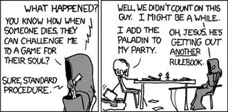 - In the followup comic Chainmail Bikini, Aragorn's player is replaced by one well-known to the DM to be a rules lawyering, minmaxing, powergaming munchkin. The DM attempts to thwart him by playing a game system he doesn't know, even demanding none of the other players give him the gamebook. One does anyway, and five minutes later, the munchkin has made this monstrosity.