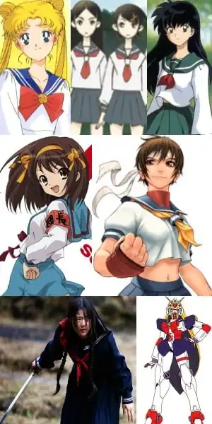 - ↑ from top left then down: Usagi Tsukino, Chiri Kitsu (L) and Kafuka Fuura (R), Kagome Higurashi, Haruhi Suzumiya, Sakura Kasugano, Saya, Nobel Gundam