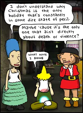 - Unusual examples in Sluggy Freelance, with Santa being infected by alien spores and his elves having to prevent him from ruining Christmas by adding same spores to all the presents.
