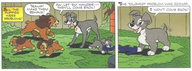 A continuation of the film, the comic follows the lives of Lady and the Tramp as they deal with their children, particularly their son Scamp, who always seems to be getting into some kind of adventure.