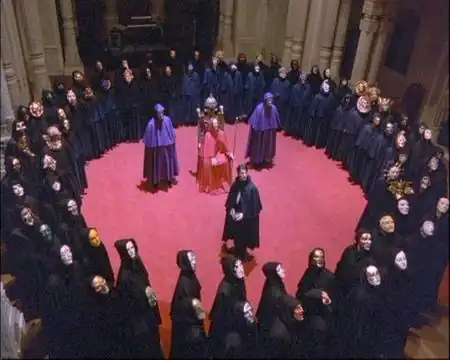 - Hilariously subverted in Hot Fuzz - black robes? Check. Meeting in secret? Check. Killing people off? Check. Being generally evil? Big damn check. Having anything to do with a reasonable, normal, evil bunch of black-clad homicidal night-meeters' goals? Noooot quite...