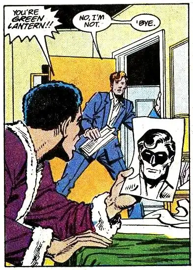 • Green Lantern John Stewart, didn't really see the need to hide his status as a galactic cop. Even his landlady knows about it (and, in one episode, attacks Flash with a broom when she mistakes him for part of his Rogues Gallery).