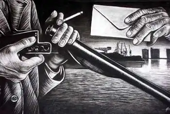 - In Blood Simple, Julian Marty tells Loren Visser about the ancient Roman practice of killing the Bearer of Bad News when the PI delivers photos of Marty's wife and her lover in flagrante delicto. Not only does Visser laugh off the posturing, he casually (later on) inverts the trope.
