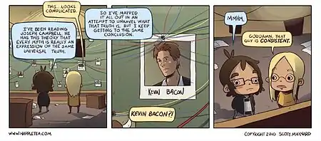 This is a game, whose title is a Mondegreen of Six Degrees of Separation, in which it is said that any actor can be linked through his or her film roles to actor Kevin Bacon within six steps. For example, George Clooney was in Ocean's Eleven with Matt Damon, Matt Damon was in The Departed with Jack Nicholson, and Jack Nicholson was in A Few Good Men with Kevin Bacon. It should be noted that this spreads across all actors; Megumi Hayashibara can be linked to Kevin in only two moves.[1] It's often a game for film nerds to test the abilities of each other.