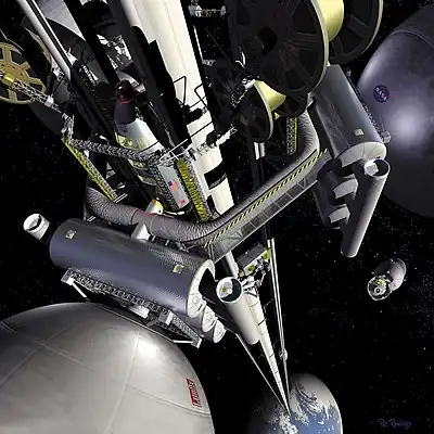 - In Accelerando by Charles Stross, space elevators are used to disassemble the inner solar system into computronium.