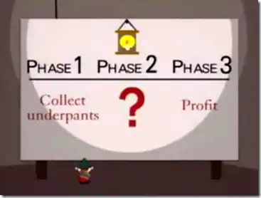 - The Underpants Gnomes from South Park, as seen in the image (and thus are the Trope Namer). They go around at night collecting vast quantities of underwear, which they will use to profit. Somehow. As shown, the chart has become a Memetic Mutation.