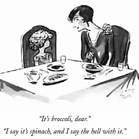 - Brussels sprouts, and other greens like broccoli, cauliflower or spinach. The quote at the top of the page is from a New Yorker cartoon about broccoli, covering two at once.