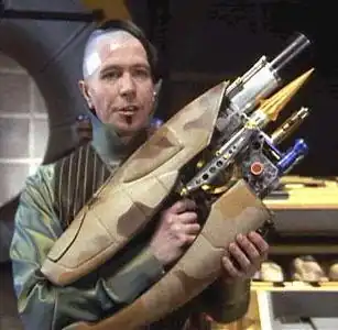 - Blake's 7 featured some of these for the last season when they started going more overtly Cyberpunk. Quite how one makes a relatively small handgun fire Frickin' Laser Beams, unspecified less-lethals, "old-fashioned percussion bullets" and a bunch of other stuff they never get around to using just by swapping magazines was glossed over.