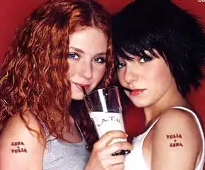 t.A.T.u. is a duo girl group consisting of Lena Katina and Yulia Volkova, originating from Moscow, Russia. Internationally speaking, they are the most renowned band to ever come out of Russia, routinely playing to audiences of 50,000 fans and selling more than 5 million copies of their debut album, 200 KM/H in the Wrong Lane. The two girls met when they were thirteen years old and were both members of a children's vocal and instrumental group called "Neposedy" ("Naughty Children"). At fourteen, Ivan Shapovalov cast Lena Katina in his new project and she recorded the single, "Yugoslavia," about NATO's bombing of Yugoslavia. Shortly after, Ivan decided to add another female singer and chose Yulia Volkova.