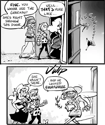 - Happened in an episode of The Simpsons: Bart and Lisa escape from Mr Burns through a laundry chute, only to find him waiting for them when they hit the ground. Lampshaded when Bart incredulously points out that it's physically impossible for Burns to have arrived first.