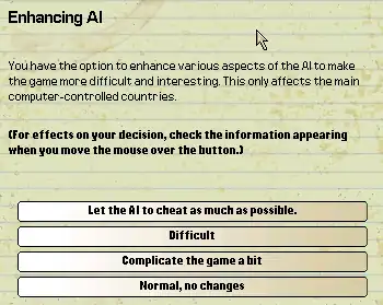 Sometimes, the computer only cheats at higher difficulty levels—particularly conscientious games may even tell you how. These are often considered exceptions to the trope: The computer is still cheating, but it's not being a bastard about it—the equivalent of differing handicap weights in thoroughbred horse racing.