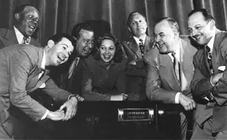 Jack (after a round of playing with Heifetz): "Honest folks, can you tell the difference?" (Even announcer Edward Arnold is laughing in splits at this stage...) |