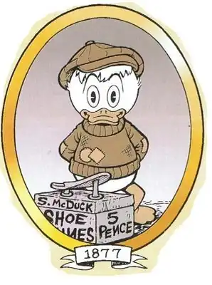 Chapter One, of course, tells how a 10-year-old Scrooge first went into business with a shoeshining kit his father made him for his birthday and earned his Number One Dime -- an American dime that was worthless to him in Scotland and made him vow to be "sharper than the sharpies and tougher than the toughies" so that he would never be cheated again. After three years of shining shoes, selling firewood and peat, and protecting the McDuck ancestral castle from the McDucks' rival clan the Whiskervilles, 13-year-old Scrooge leaves home to seek his fortune in America.