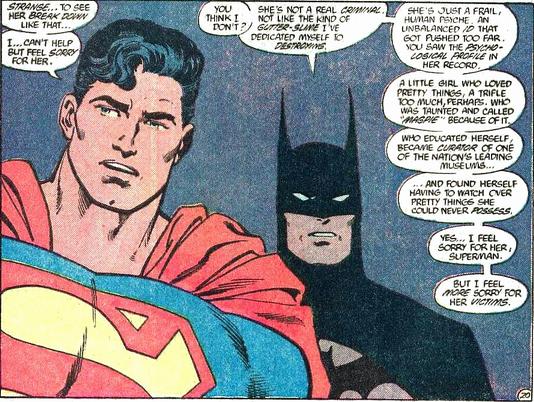 - Superman investigates a vigilante in Gotham City, and winds up helping Batman crack his latest case. The two heroes gain a grudging respect for each other, but (in deliberate contrast to the Pre Crisis status quo) are too different in outlook to become close friends.