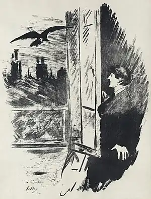 It tells the tale of an unidentified narrator who is mourning the loss of his love, Lenore, when he is interrupted by the tapping of a raven whose constant repetition of the word "Nevermore" increasingly aggravates him to the point of madness.