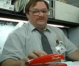 - Named after the red Swingline stapler in Office Space. As the DVD commentary mentions, the one in the movie was specially painted, since at the time the movie was produced, the company didn't make red office staplers, only black ones (although they had been making red mini staplers for decades). Due to the popularity of the movie, they do now.