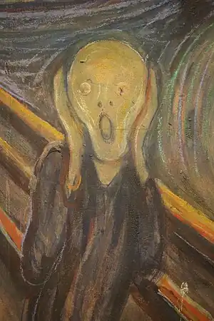 As an alternative, this can be done as an explicit parody of Edvard Munch's painting The Scream; in particularly well-done instances, the art style will morph rapidly to match Munch's expressionist style for a few seconds.