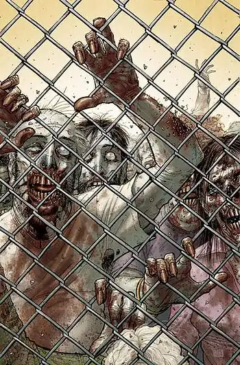 The Walking Dead is a Zombie Apocalypse Comic Book, written by Robert Kirkman with art by Charlie Adlard, featuring an ensemble cast (which is constantly in flux) of survivors struggling to survive over the long-term duration of the zombie uprising. The de facto main character is Rick Grimes, a police officer who was shot in the line of duty; when he wakes up from a Convenient Coma, all hell has broken loose. Rick goes in search of his family and safety, both of which end up being more tenuous than not.